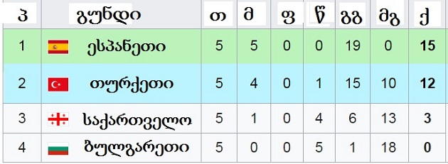 ხუთი ტურის შემდეგ საქართველოს ნაკრები E ჯგუფში მე-3 ადგილზეა ერთი მოგებით და ჯგუფიდან გასვლის თეორიული შანსიც აღარ აქვს. პირველ და მეორე ადგილებზე ესპანეთი (15) და თურქეთია (12). ბულგარეთი კი, რომელმაც ყველა მატჩი წააგო, 0 ქულით ბოლო ადგილს იკავებს.
